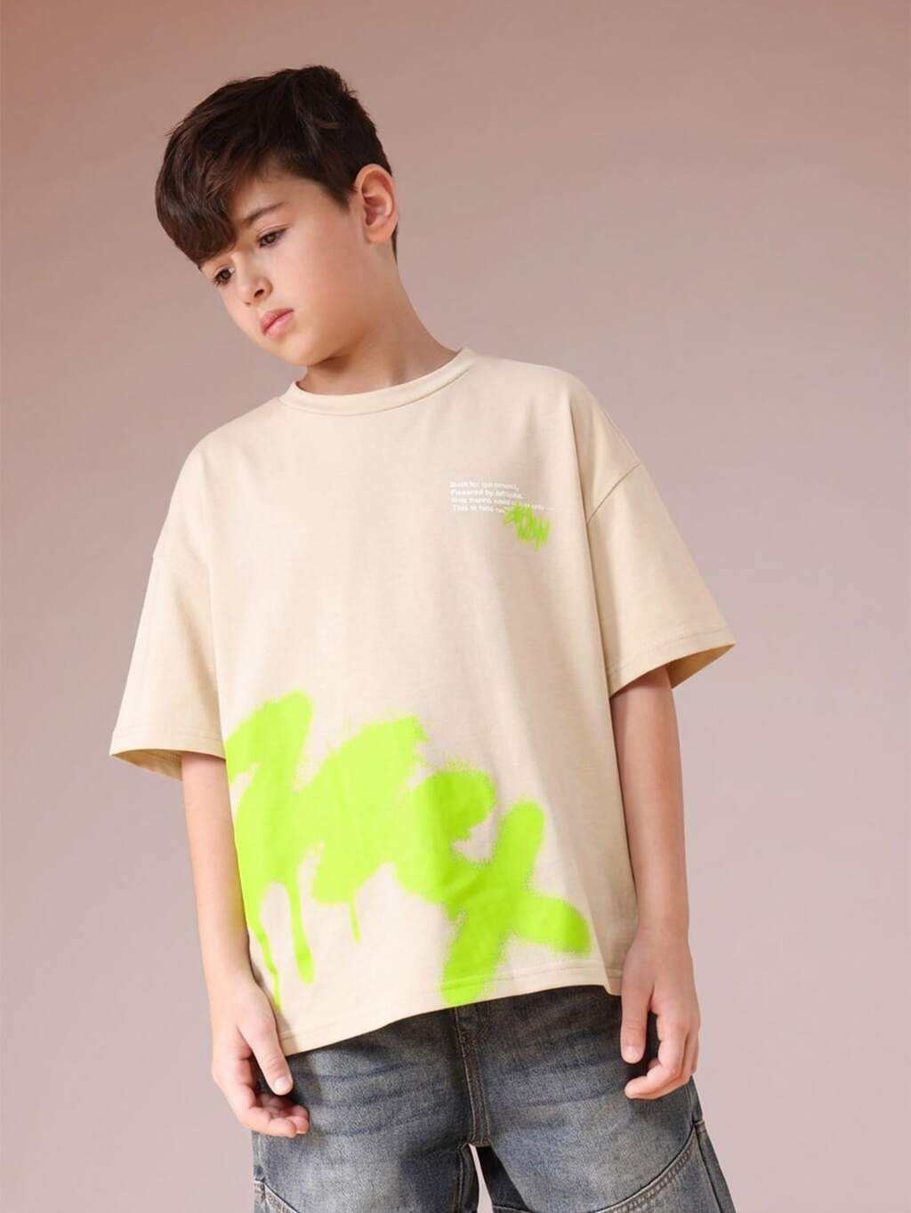 Maglietta oversize da ragazzo con stampa grafica e design graffiti verde neon, collo equipaggio, maniche corte, casual estivo, streetwear