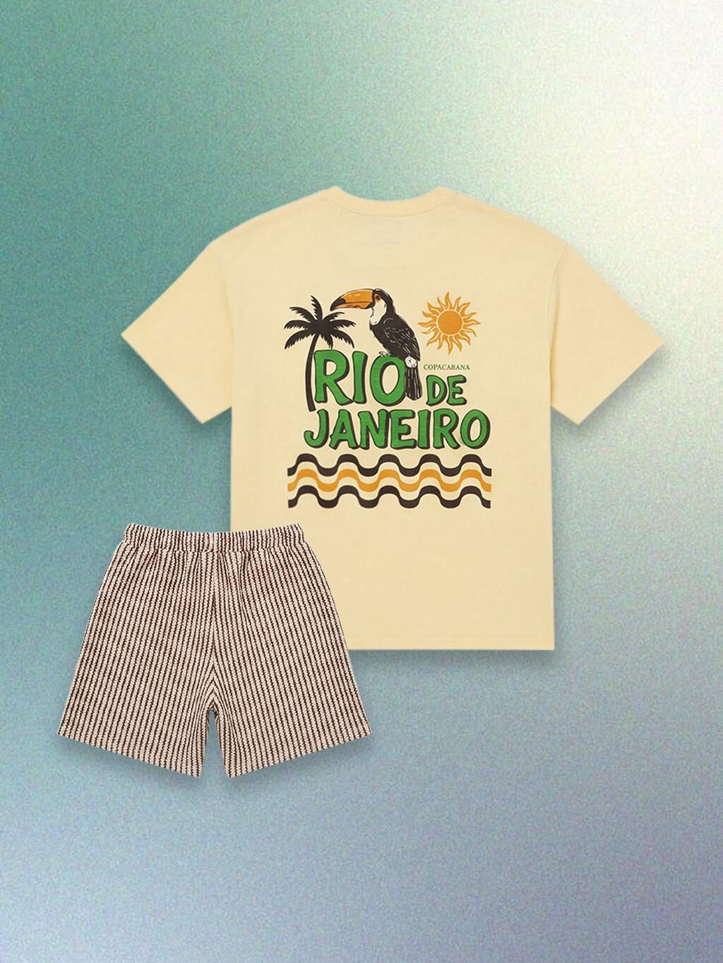 Set estivo da ragazzo pre-adolescente con maglietta a maniche corte con scollo a equipaggio con stampa di tucano, palme e Copacabana di Rio de Janeiro, e pantaloncini a righe per vacanza al mare