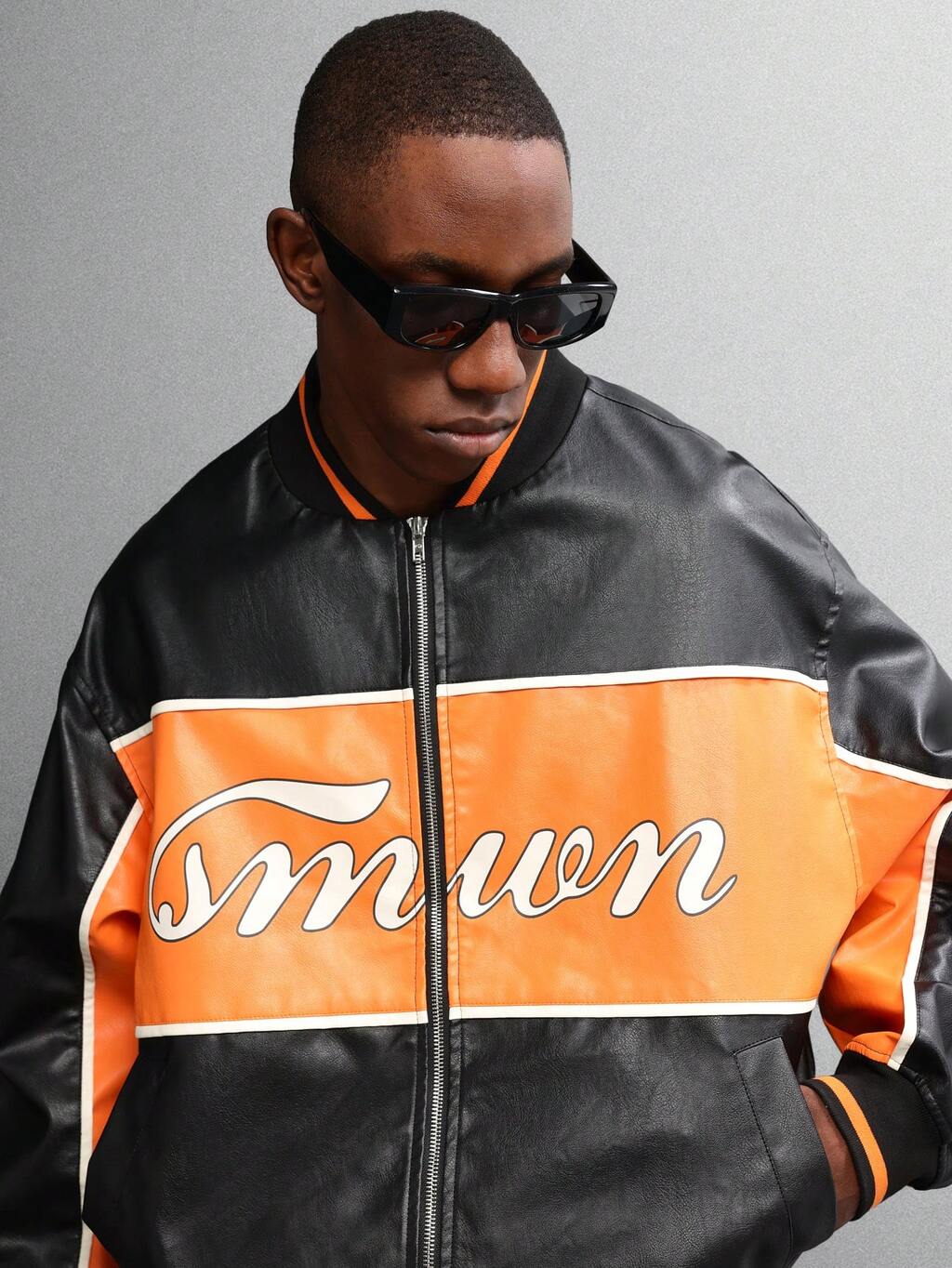 Giubbotto bomber color block con finiture a coste e testo del marchio