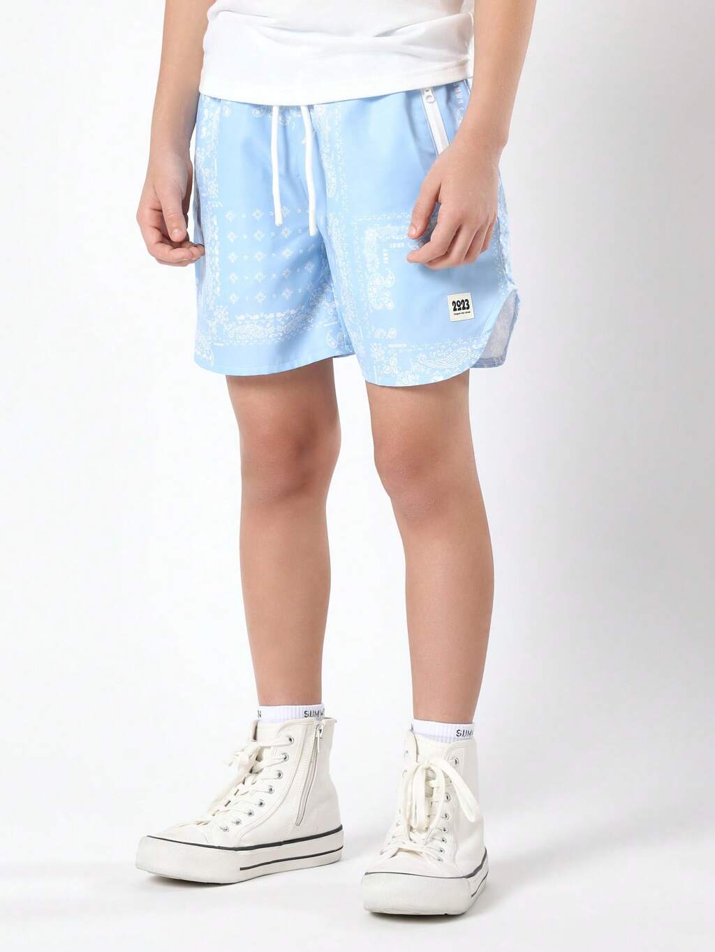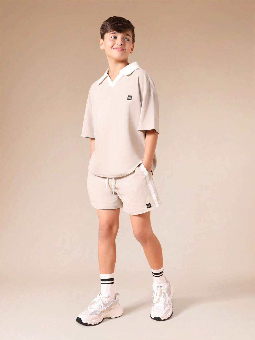 Set coordinato per ragazzi pre-adolescenti, composto da t-shirt a girocollo a maniche corte e pantaloncini estivi, con dettaglio di stampa laterale