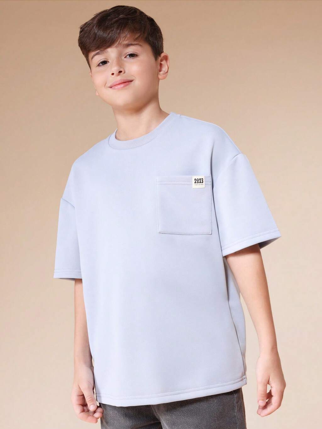 Maglietta casual a girocollo a maniche corte blu chiaro con taschino e piccolo logo, vestibilità regular, adatta per la scuola e l'uso quotidiano