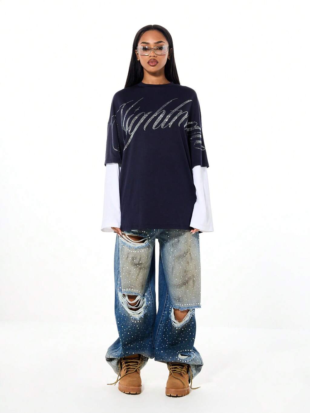 T-shirt oversize a strati con scritta in strass SUMWON WOMEN e maniche a contrasto