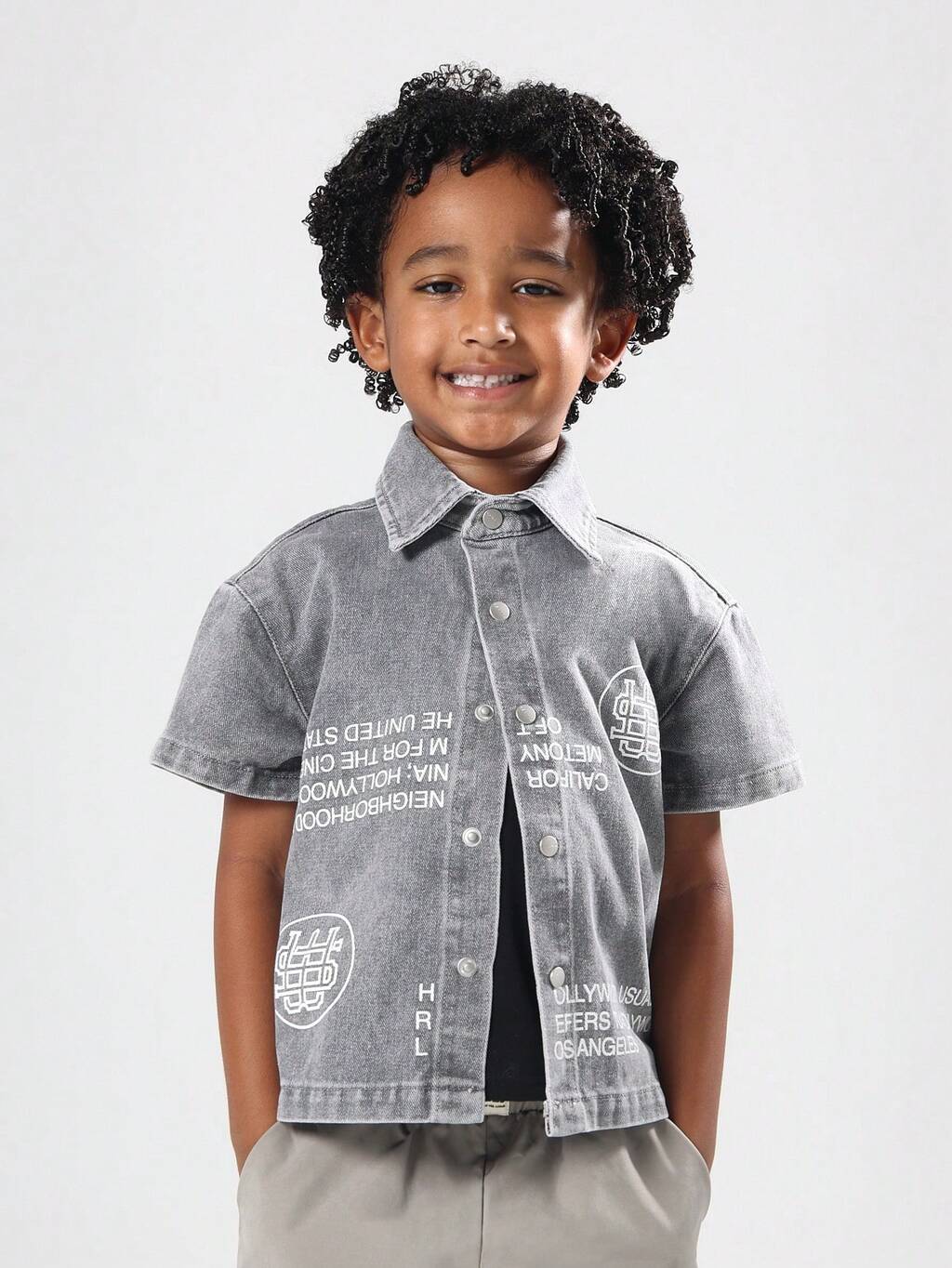 Camicia in denim grigio con bottoni e stampe di testo grafico
