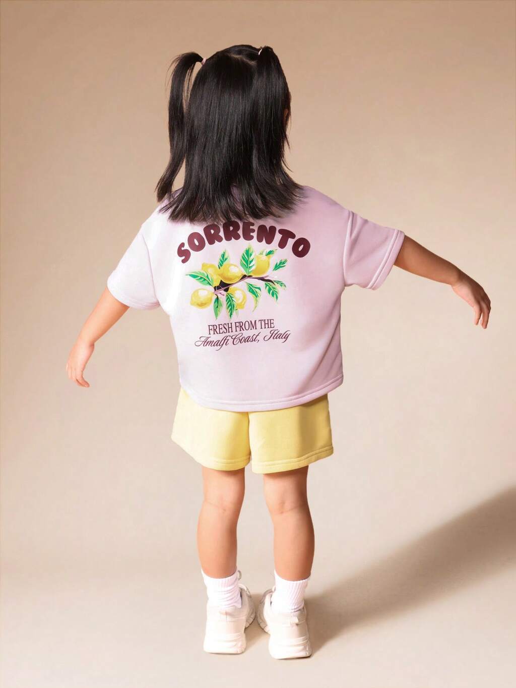 Completo composto da maglietta lavanda e pantaloncini gialli con stampa di limoni