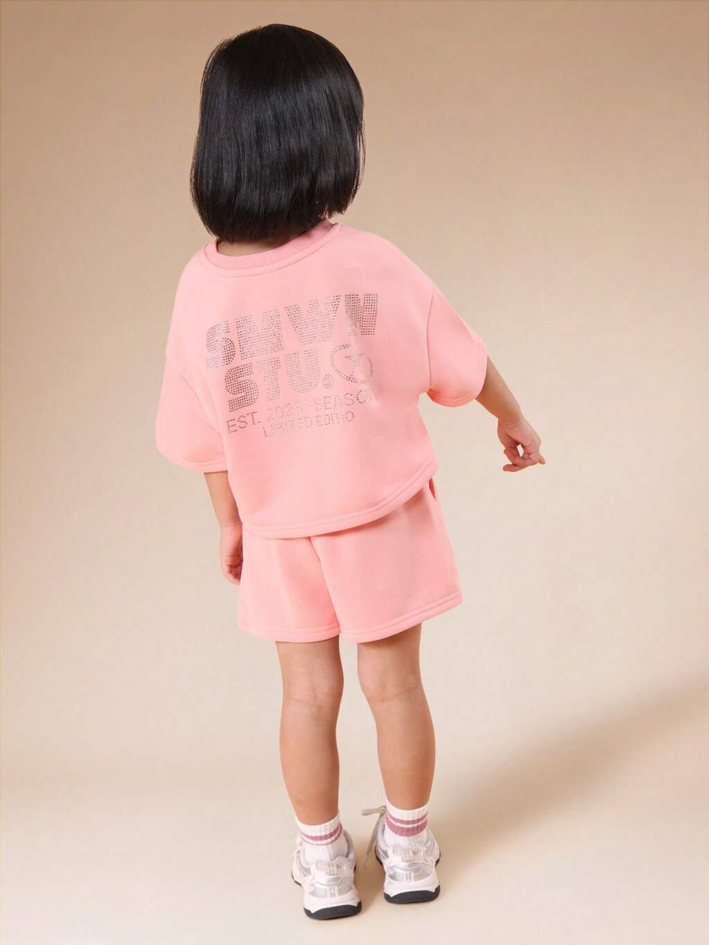 Set coordinato estivo da ragazza con t-shirt rosa oversize e pantaloncini abbinati, con stampa di luna con strass, collo a giro e maniche corte