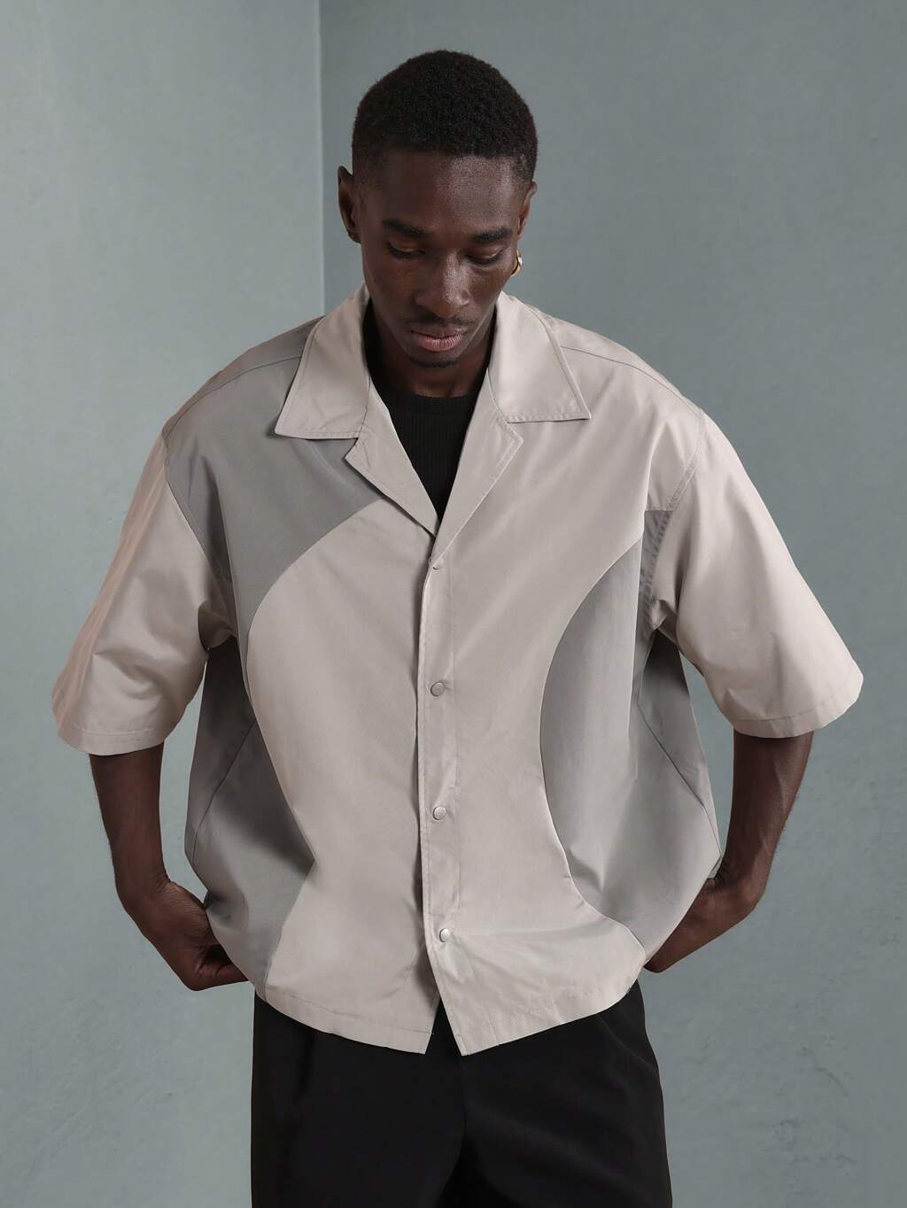Camicia a maniche corte in nylon a taglio boxy con colletto a contrasto e stampa grafica
