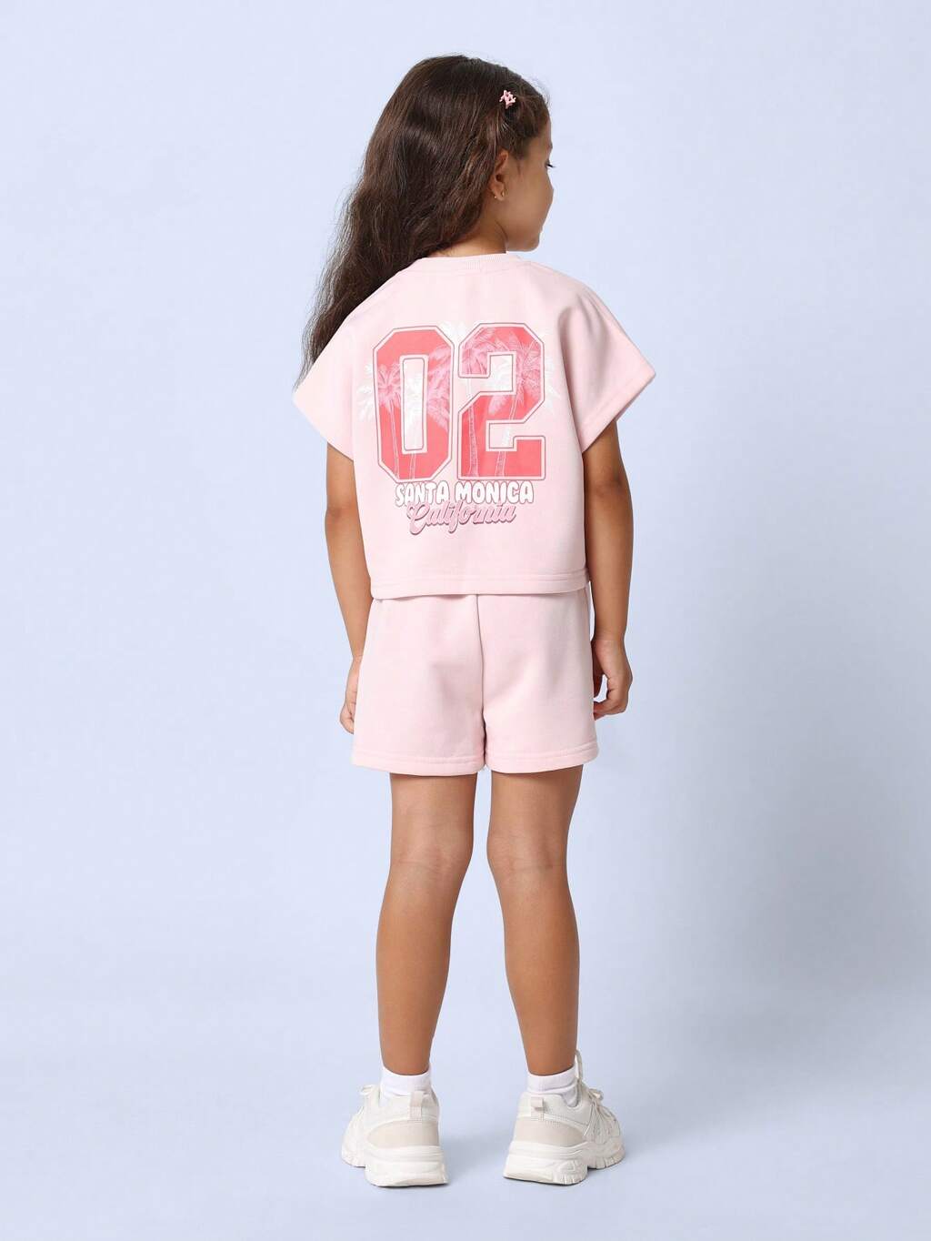 女の子用ライラッククルーネック半袖Tシャツとショーツのコーディネートセット、テキストプリントサイドパネル付き、夏カジュアルコーデ