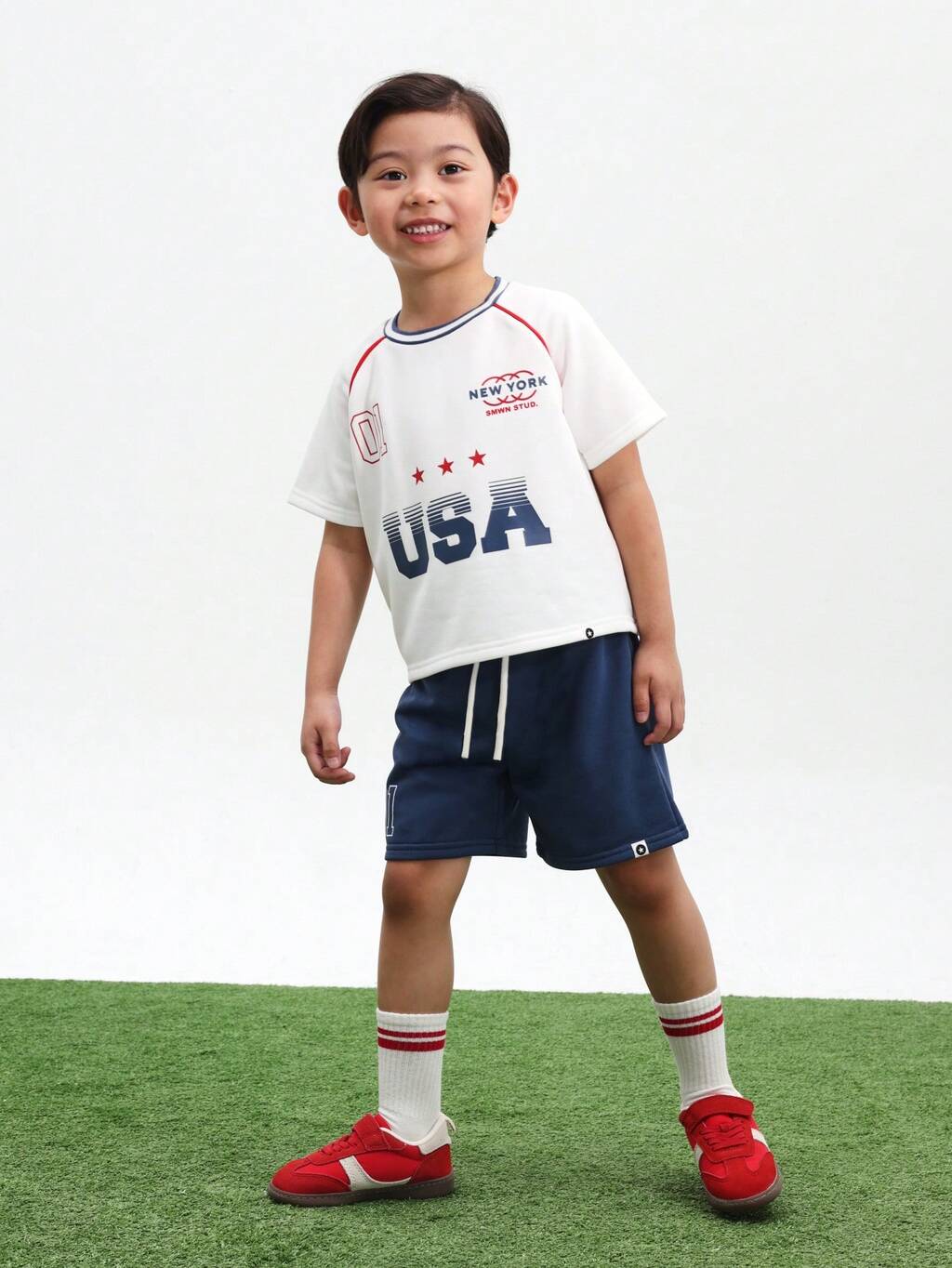 ボーイズ USA ジャージセット 半袖クルーネックTシャツ ネイビーレギュラーフィットショーツ サマーカジュアルアウトフィット スポーツインスパイアドプリント