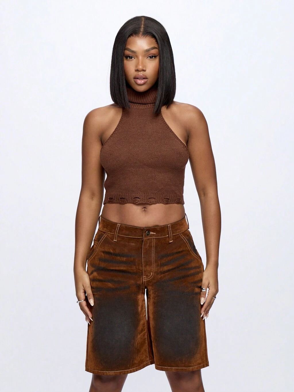 SUMWON WOMEN リブ編みのノースリーブタートルネッククロップニットトップス(テクスチャードヘム)