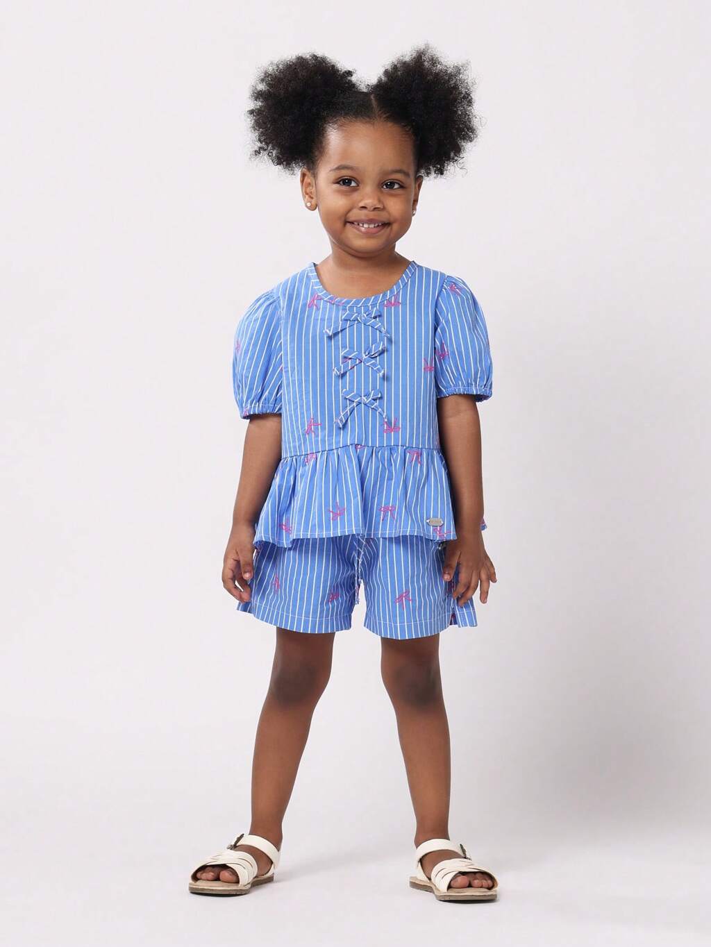 リボンディテールのストライプ柄パフスリーブトップスとお揃いのショーツ