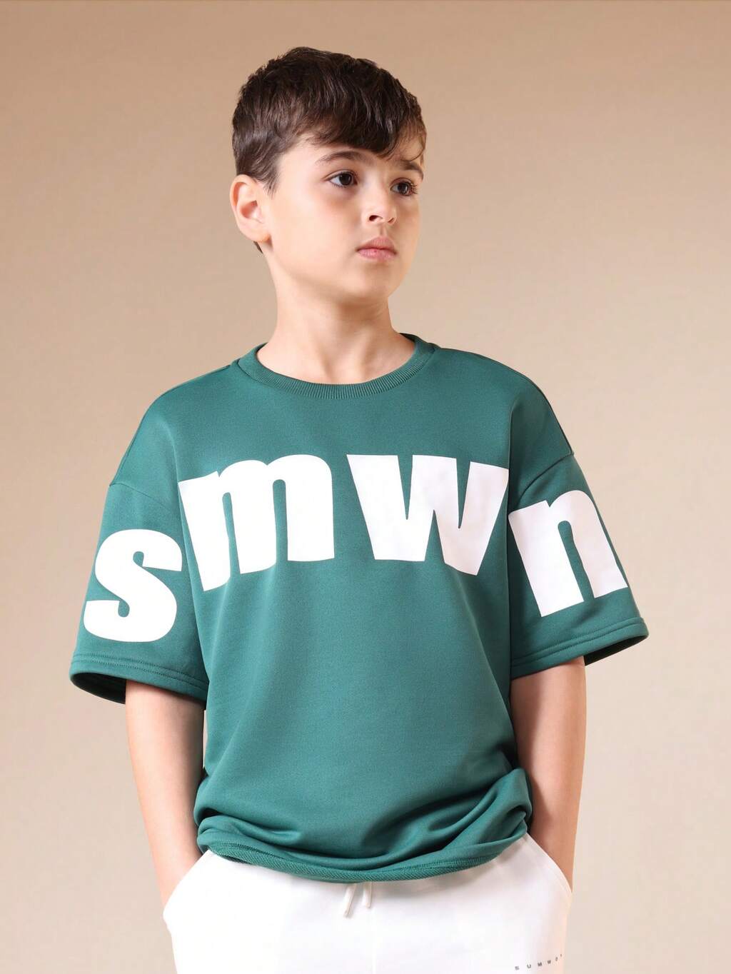白い文字が入った緑のクルーネックTシャツ