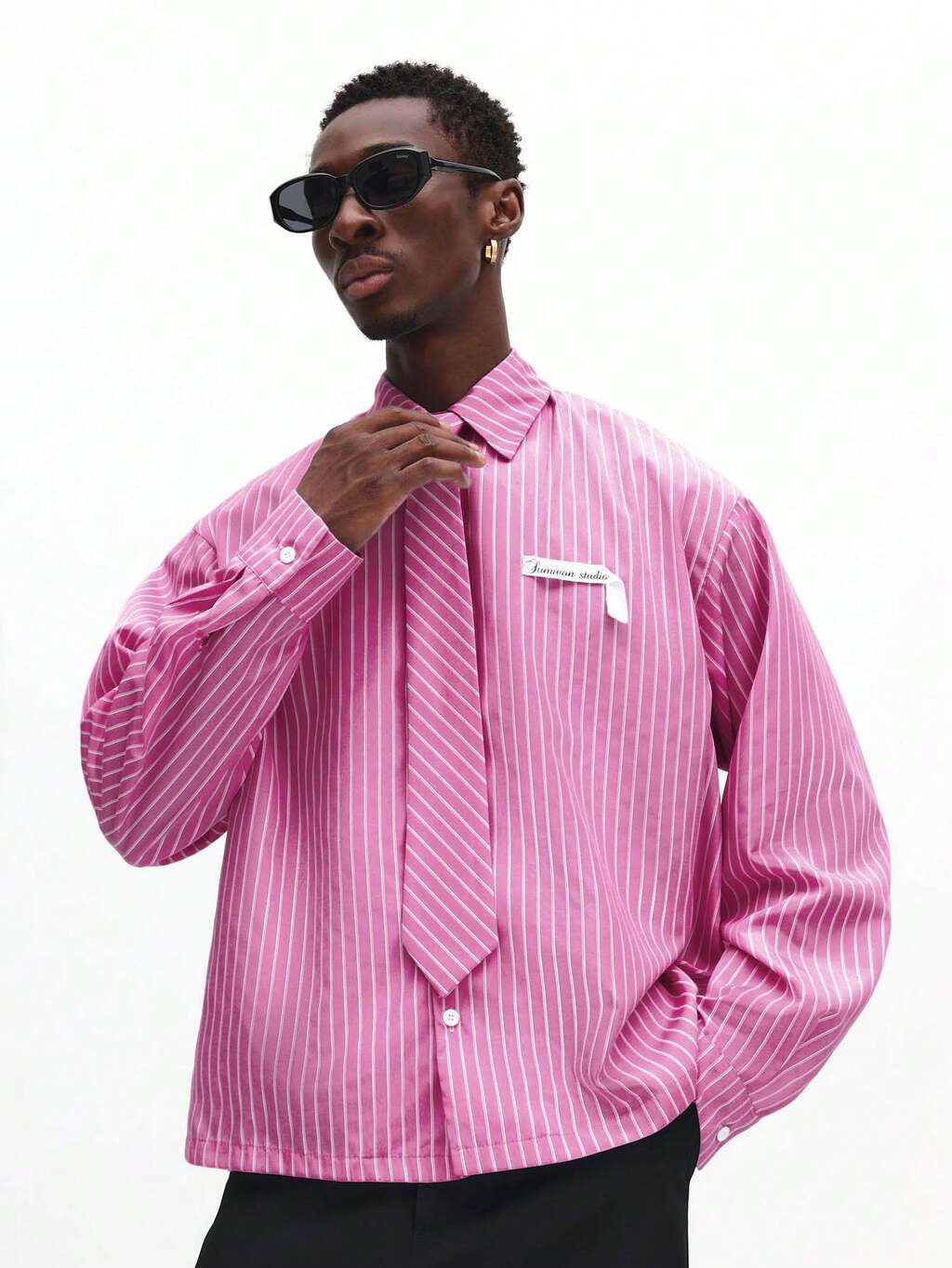 ネクタイ付きクロップド丈ピンストライプシャツ