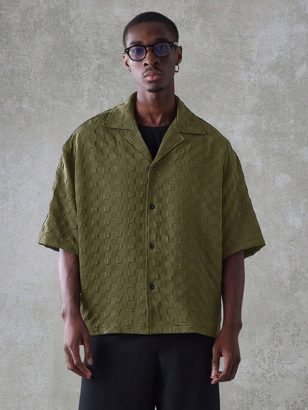テクスチャード加工の半袖ボタンダウンルーズフィットキャンプカラーシャツ