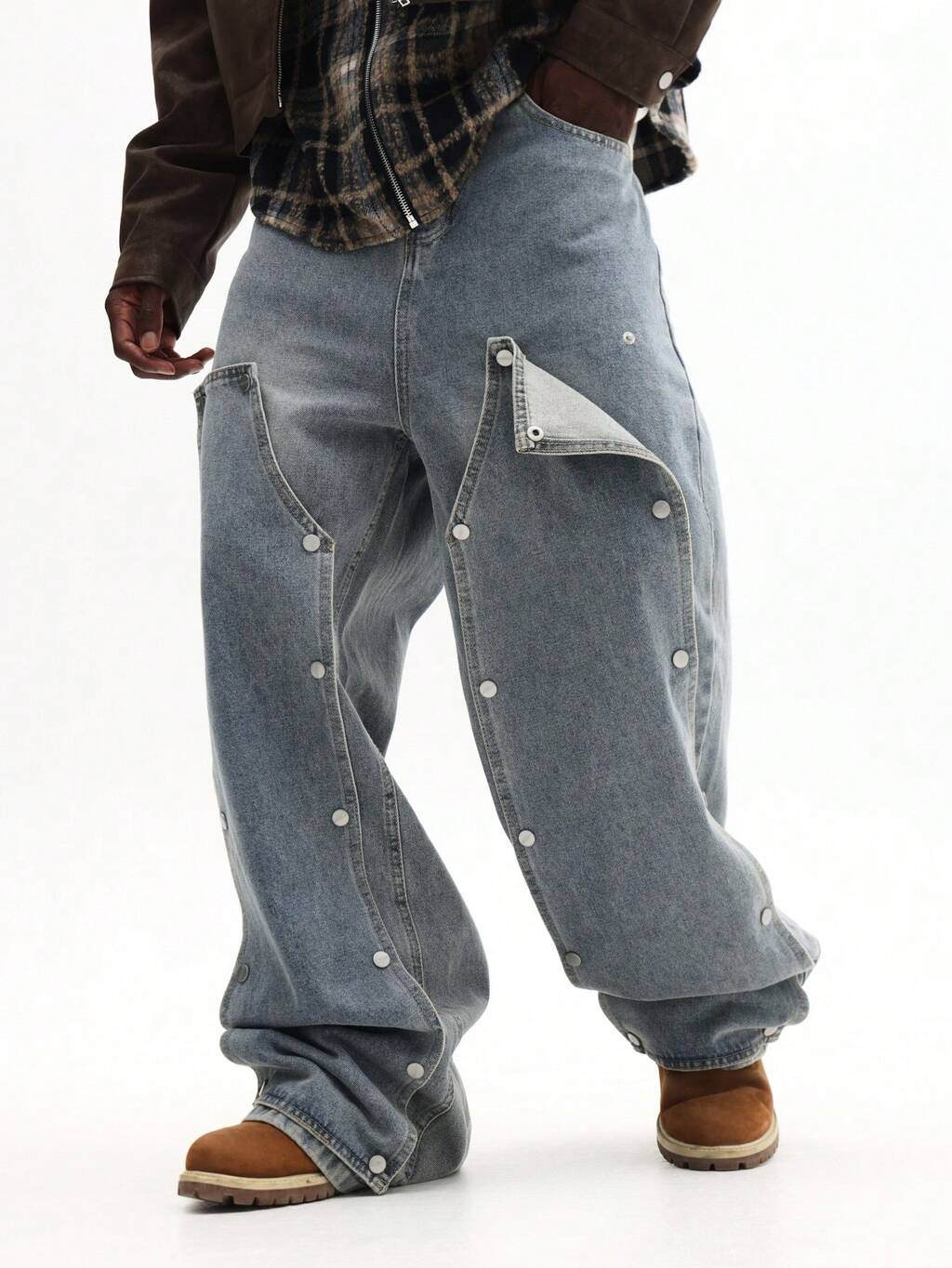 スナップディテールのバギーカーペンターデニムジーンズ