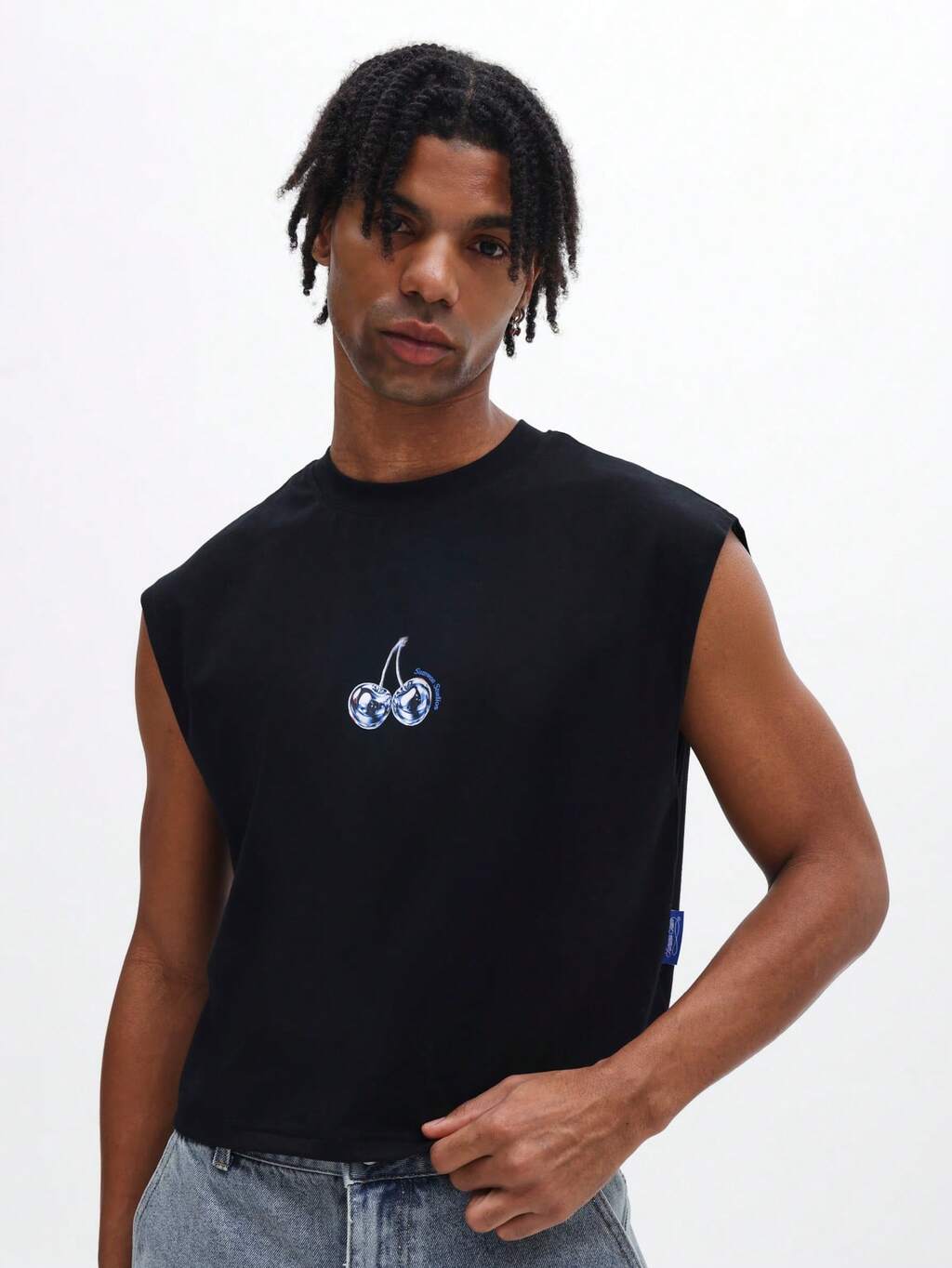 メンズ ノースリーブ さくらグラフィック クロップタンクトップ クルーネック サマーファッション マッスルTシャツ ヴィンテージスタイル フルーツプリントデザイン