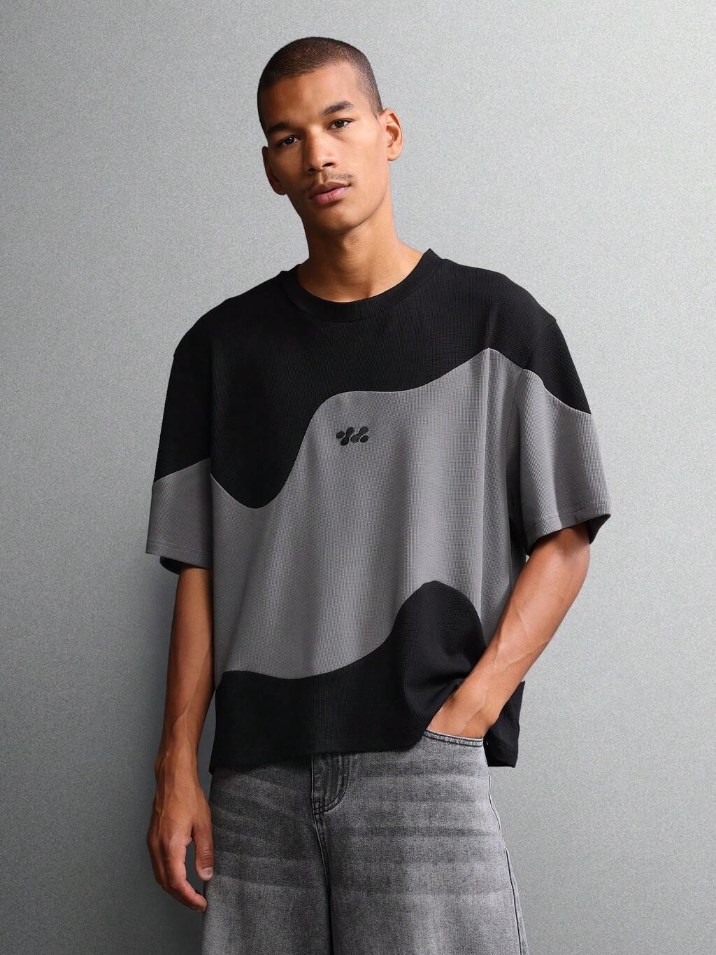 クルーネックのオーバーサイズウェーブカラーブロックTシャツ