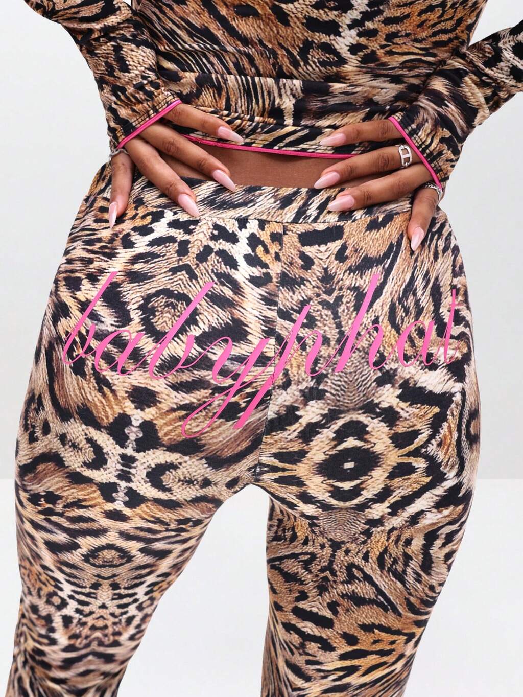 BABYPHAT レオパード柄フレアボトム カジュアルパンツ ストレッチ快適フィット レディース ウエストフォールドオーバー プリントレギンス