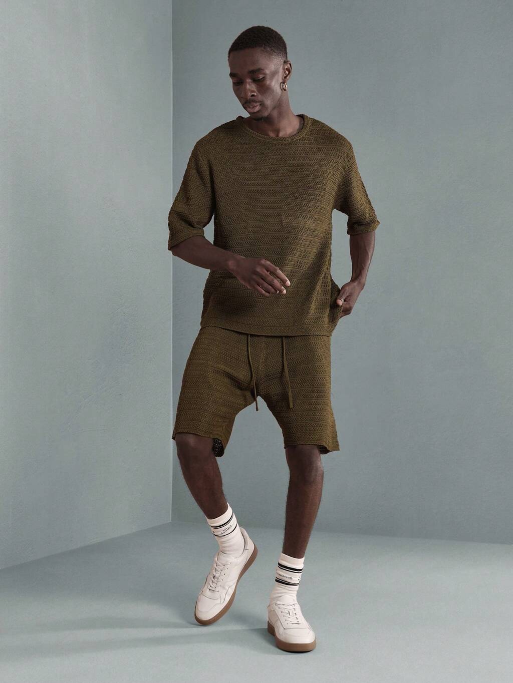 コントラストトリムのケーブルニットカーディガンとショーツセット