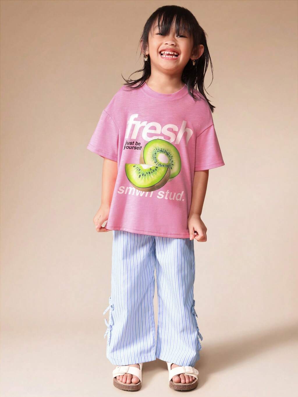 키위 프린트 티셔츠와 스트라이프 팔라초 팬츠 세트