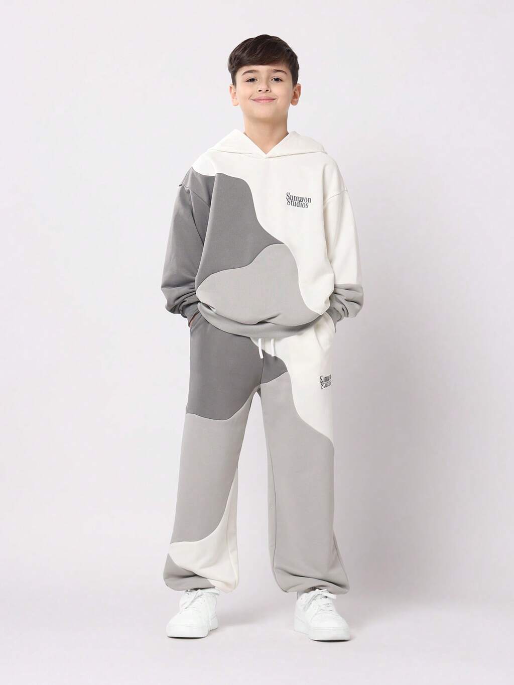 보이 투피스 캐주얼 세트 크림 오버사이즈 티셔츠 그린 트랙 팬츠 일상 편안한 의상 스타일 코디 세트