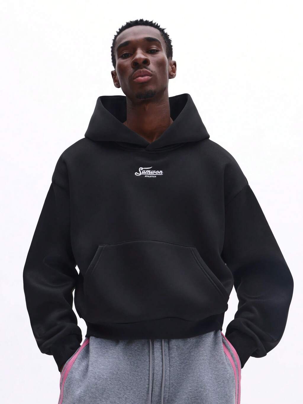 센터 포켓과 미니멀한 로고 프린트가 돋보이는 크롭 후드 티셔츠
