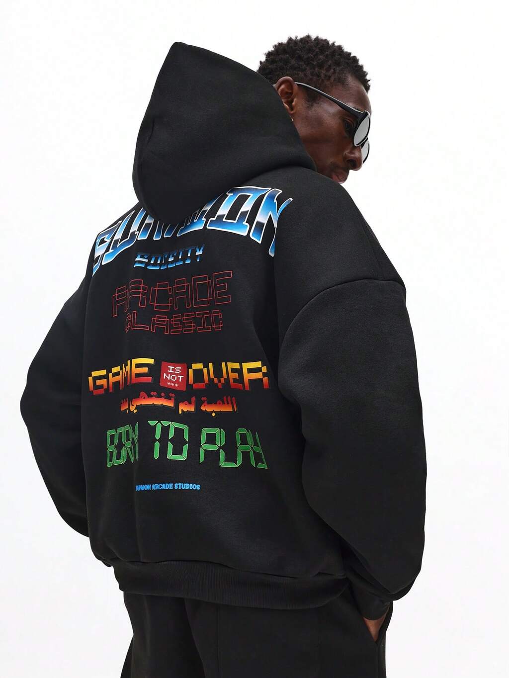 게임 그래픽이 있는 박스형 오버헤드 후드 티셔츠