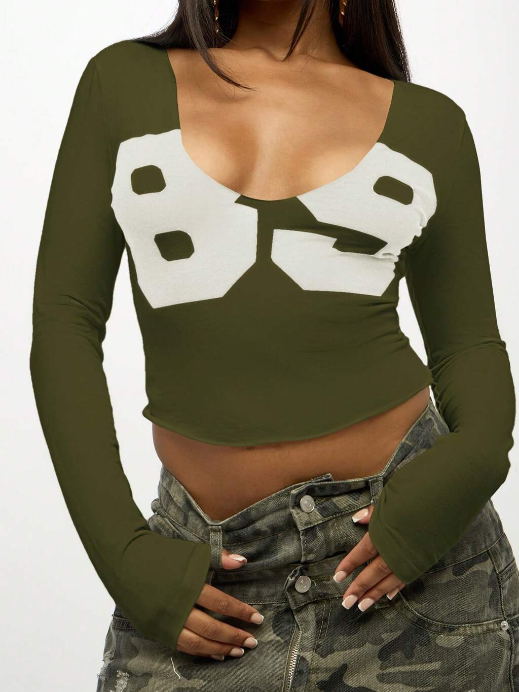 플러스 사이즈 포에버 94 바시티 크롭 탑 긴팔 카무플라주 프린트 컬러 블록 스트릿웨어 캐주얼 브이넥 가을 겨울 패션