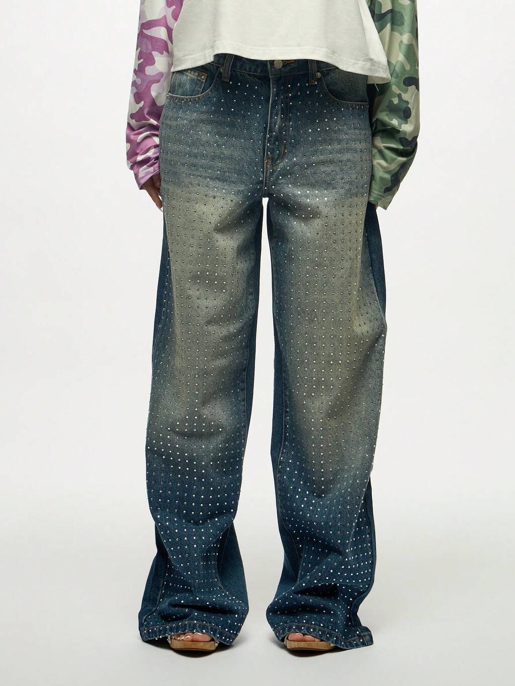 SUMWON WOMEN 그라데이션 워싱 크리스털 스터드 와이드 레그 데님 진