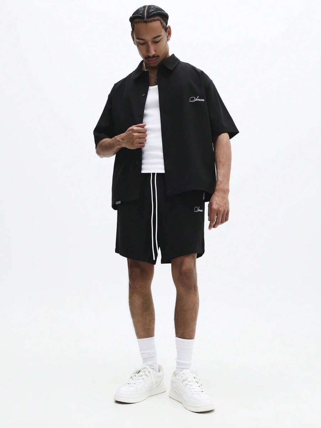 남성용 블랙 오버사이즈 크루넥 티셔츠 및 캐주얼 반바지 코디 세트 (뒷면 텍스트 프린트 포함)