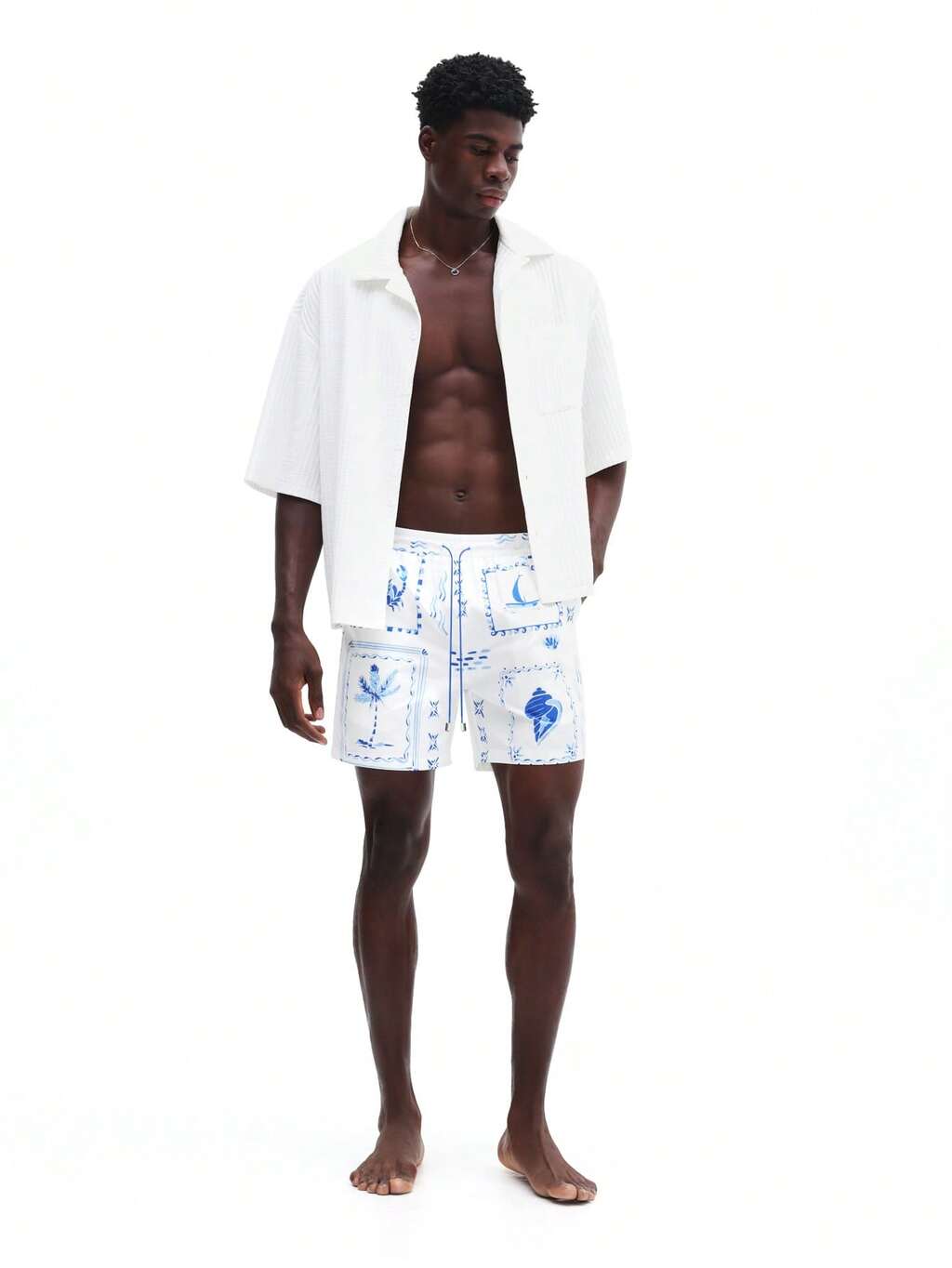 남성 비치 짧은 길이 수영 트렁크, 해양 테마 블루 프린트 패턴 여름 휴가 수영장 수상 스포츠 수영복