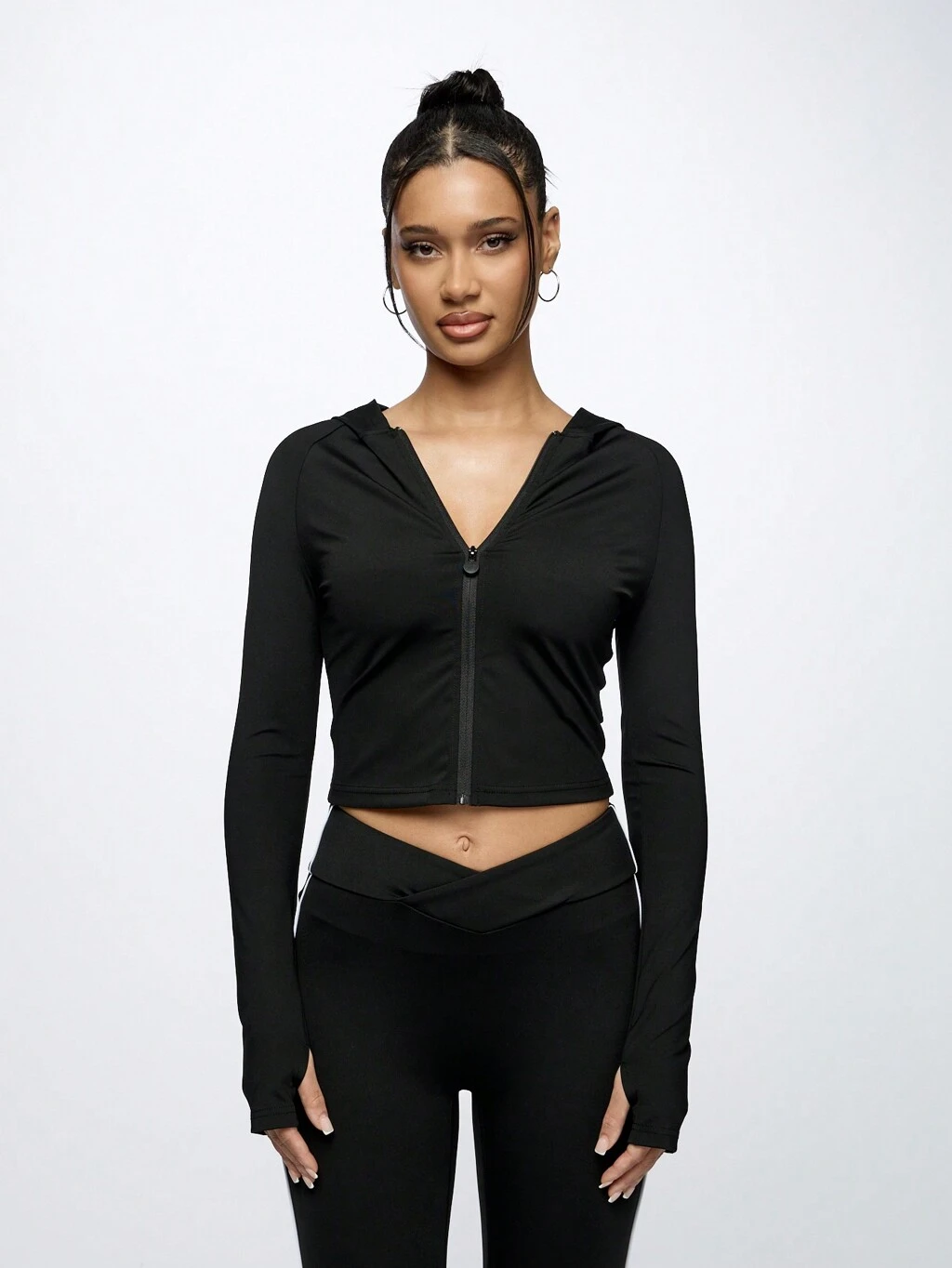 SUMWON WOMEN 지퍼 프런트 후드 크롭 애슬레틱 재킷