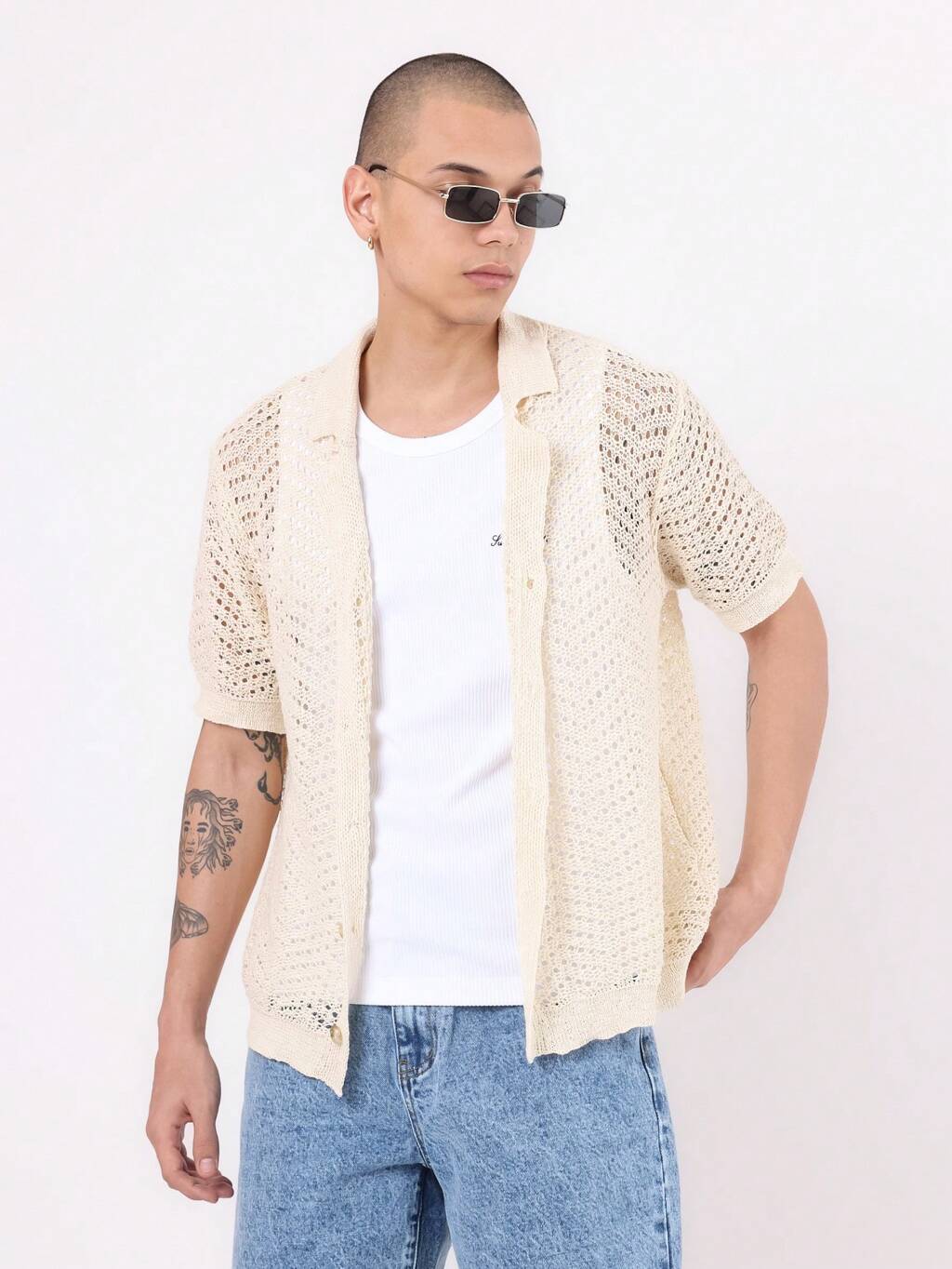 가벼운 반팔 크로셰 버튼 다운 셔츠