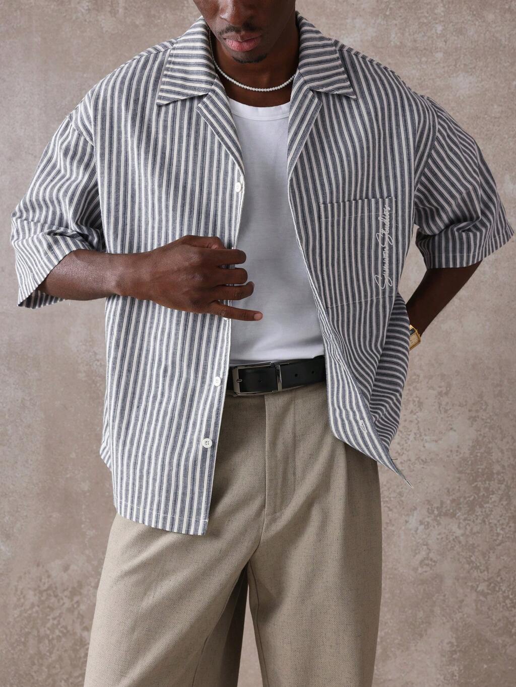 Boxy Fit Revere Collar Short Sleeve Textured Stripe Shirt