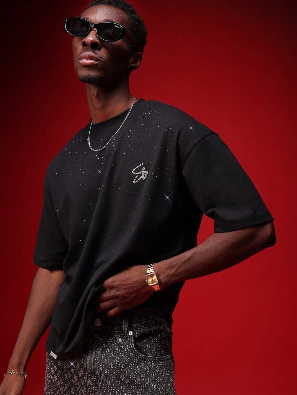 Crew Neck Tee With Scattered Rhinestones