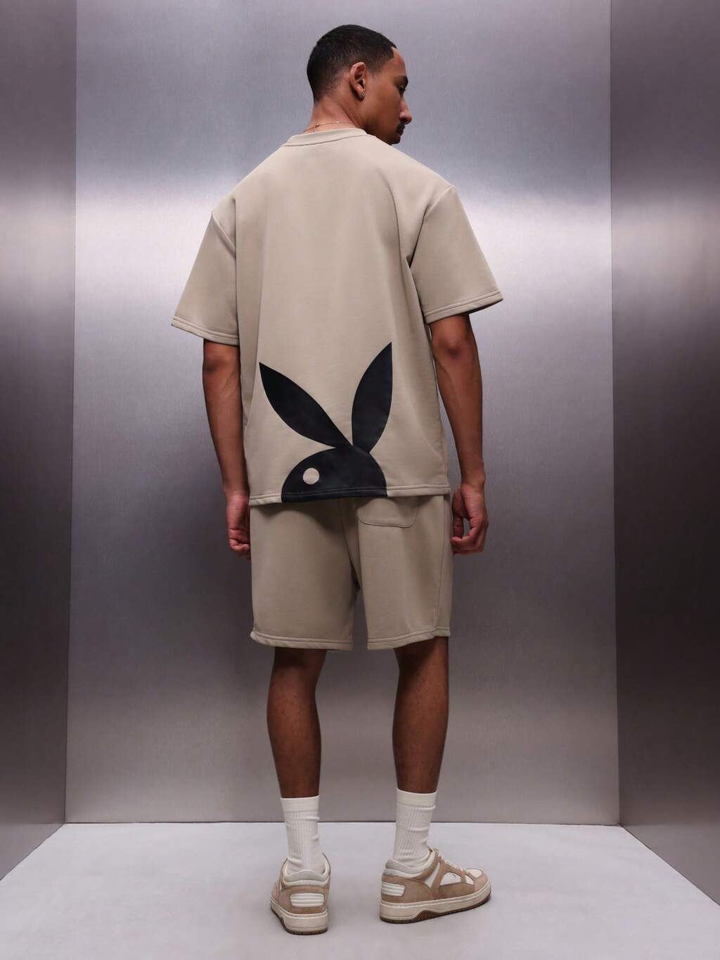 PLAYBOY X SUMWON Beige Jersey T-Shirt And Shorts Co-Ord Set With Crew Neckline Oversized Fit Bunny Graphic Design Regular Length Summer Casual Wear