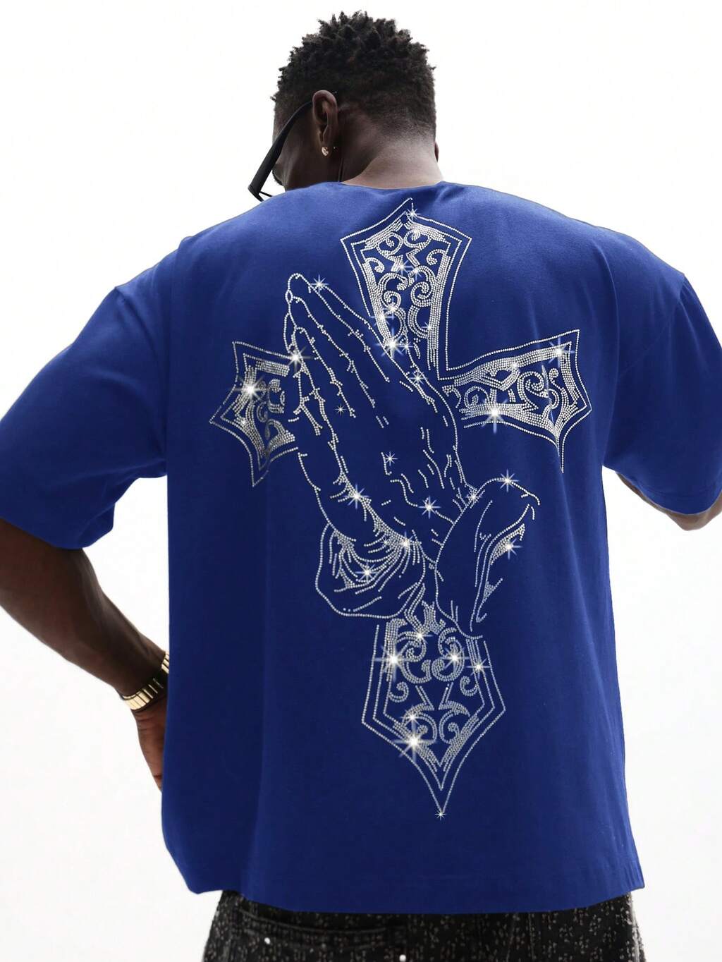 Crop Fit Men's Oversized Rhinestone Cross Graphic T-Shirt Blue Cotton Crew Neck Short Sleeve Casual Summer Streetwear