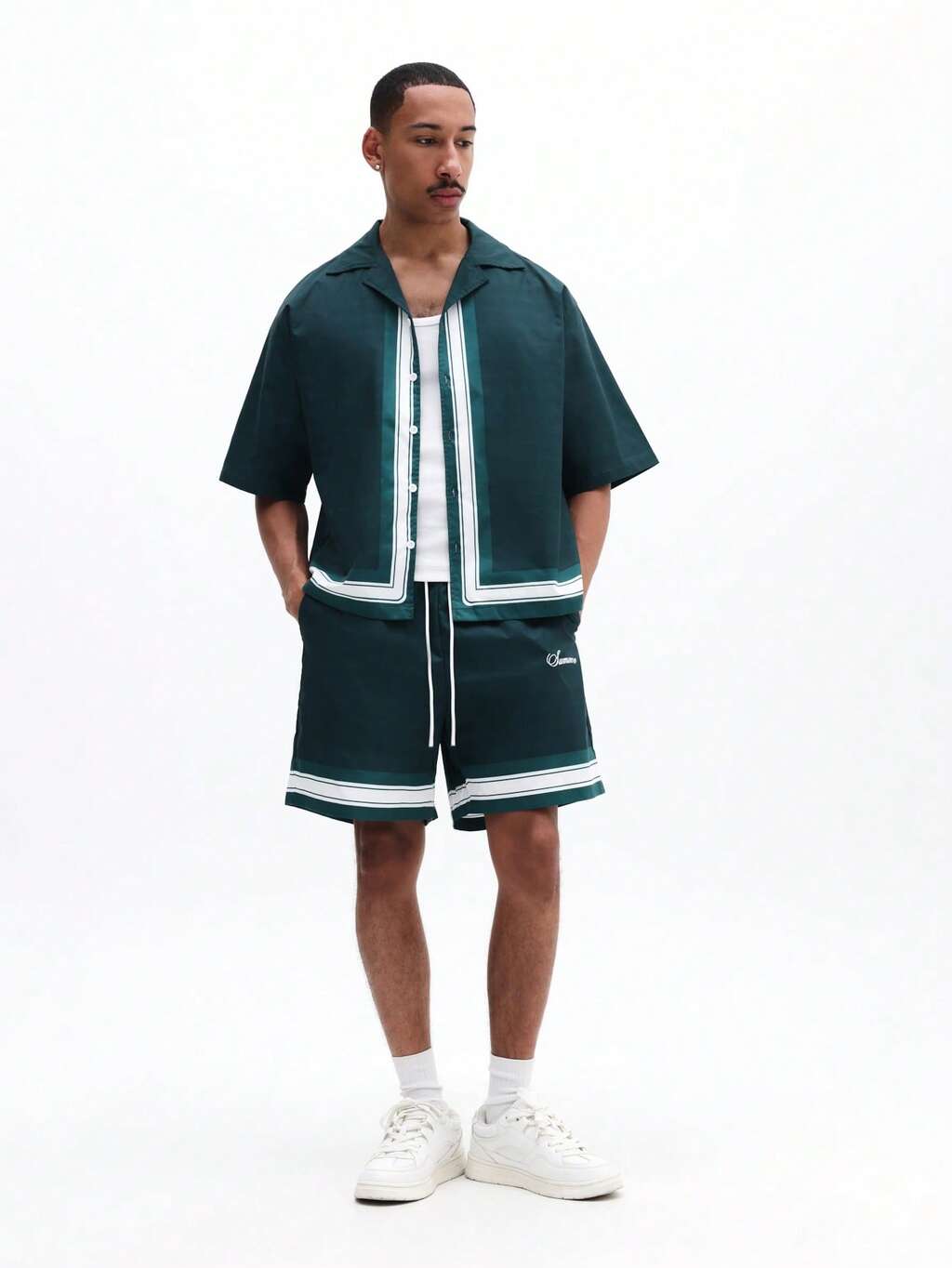 Men Relaxed Button Up Shirt And Matching Drawstring Shorts Two Piece Coordinating Set With White Contrast Trim Detail