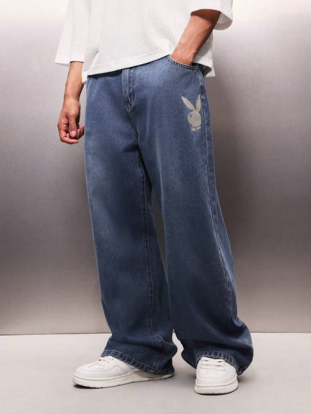 PLAYBOY X SUMWON Men's Relaxed Baggy Logo Denim Jeans Wide Leg Casual Streetwear Medium Wash Blue Pants