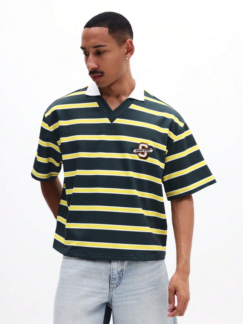Men's Boxy Polo Shirt With Horizontal Stripes V-Neck Short Sleeve Casual Summer Top With Logo Detail