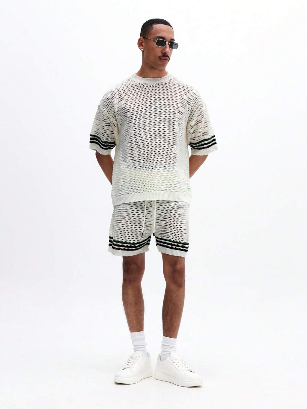 Mesh Knit Short Sleeve Sweater And Shorts Set With Striped Trim