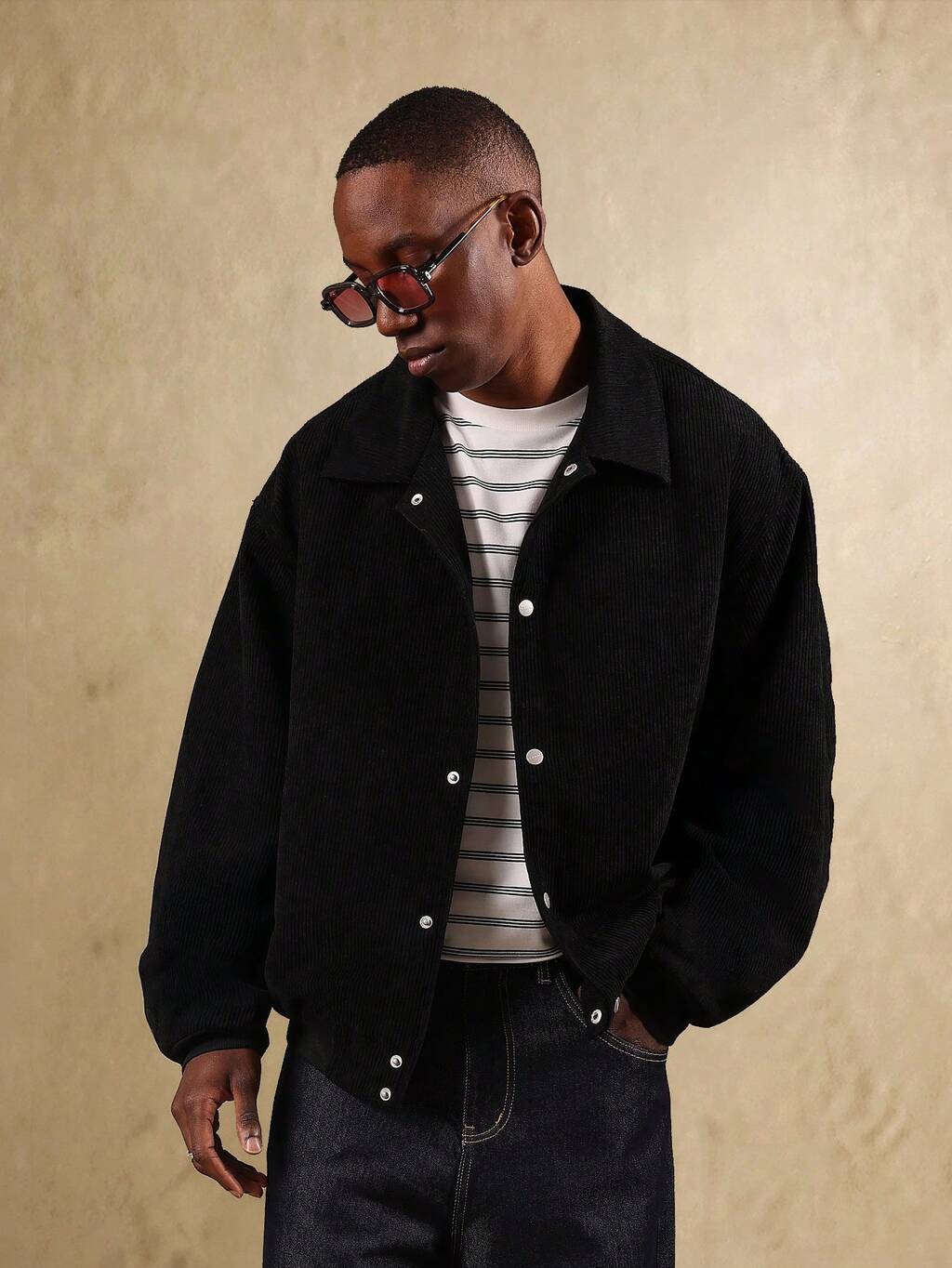 Corduroy Harrington Jacket With Ribbed Trim And Button Front