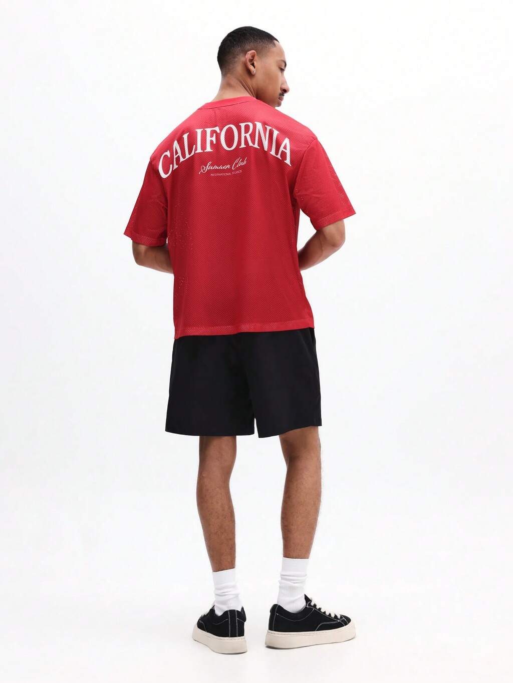 Men's Mesh Beach Set With California Text Print Summer Vacation Swimwear Outfit Casual Drawstring Shorts And Short Sleeve Top