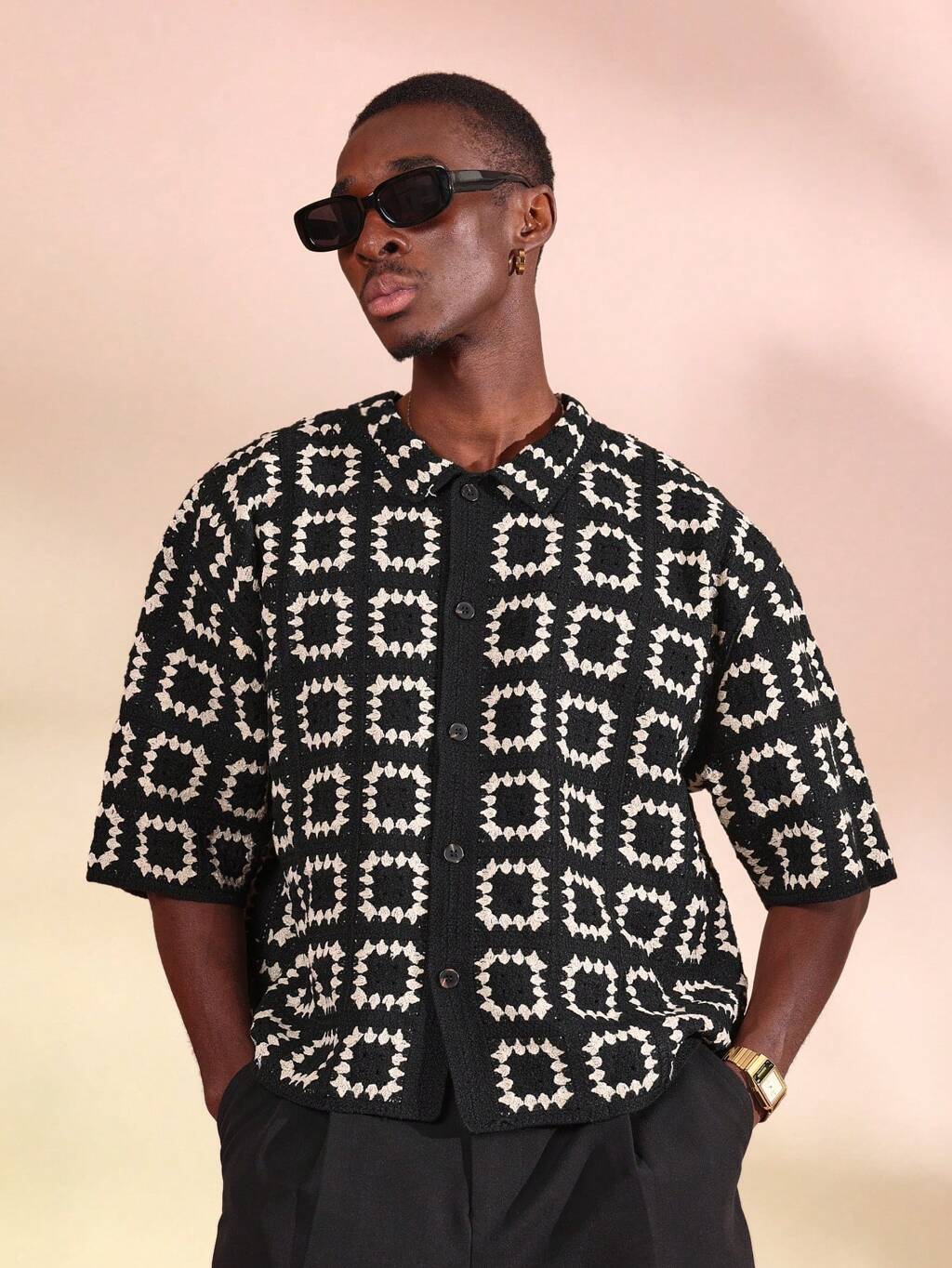 Men Oversized Crochet Knit Button Down Cardigan