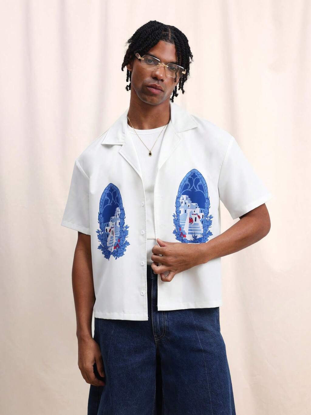 Men's Regular Fit Short Sleeve Graphic Tee With Scenic Mediterranean Print Design Button Down Shirt White Summer Casual Top