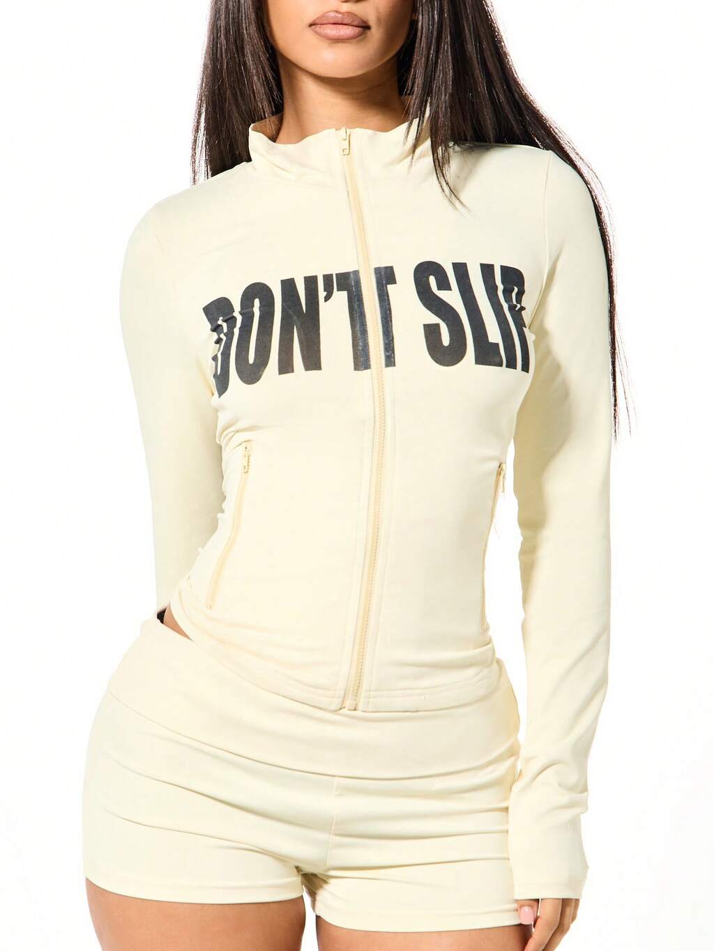 SUMWON WOMEN Fitted Zip Through Funnel Neck Slogan Sweatshirt Yellow Don't Slip Graphic Print Long Sleeve Casual Streetwear