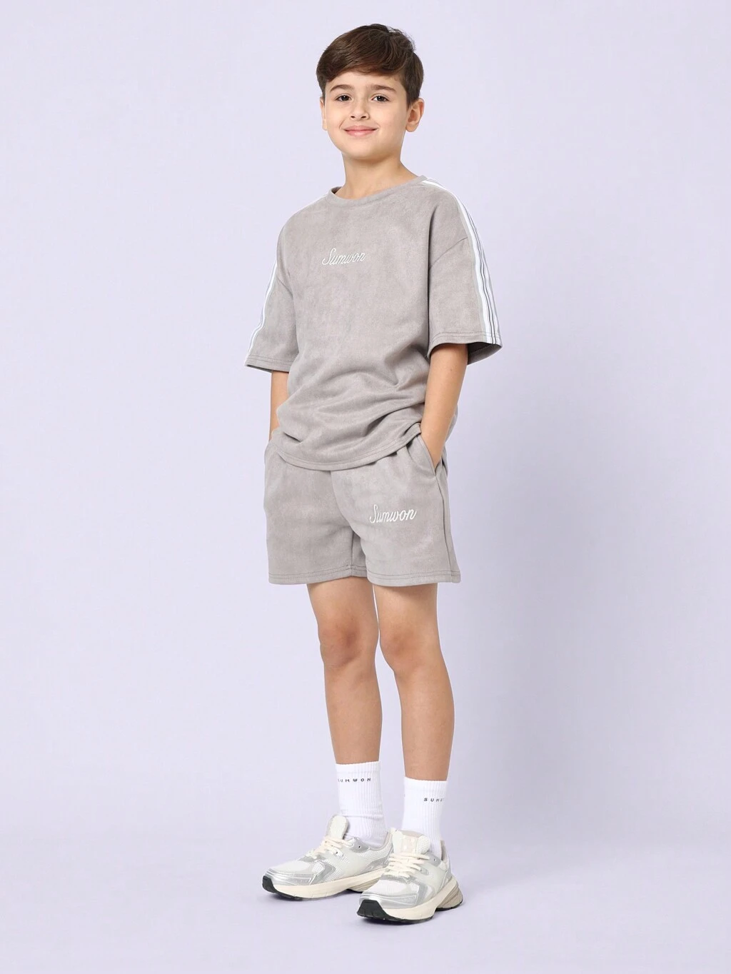 Teksturowany zestaw T-shirt i szorty z kontrastowymi paskami