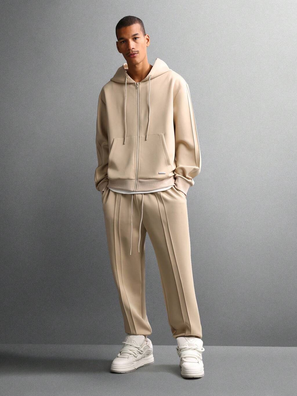Beżowy zestaw składający się z bluzy z kapturem i spodni dresowych