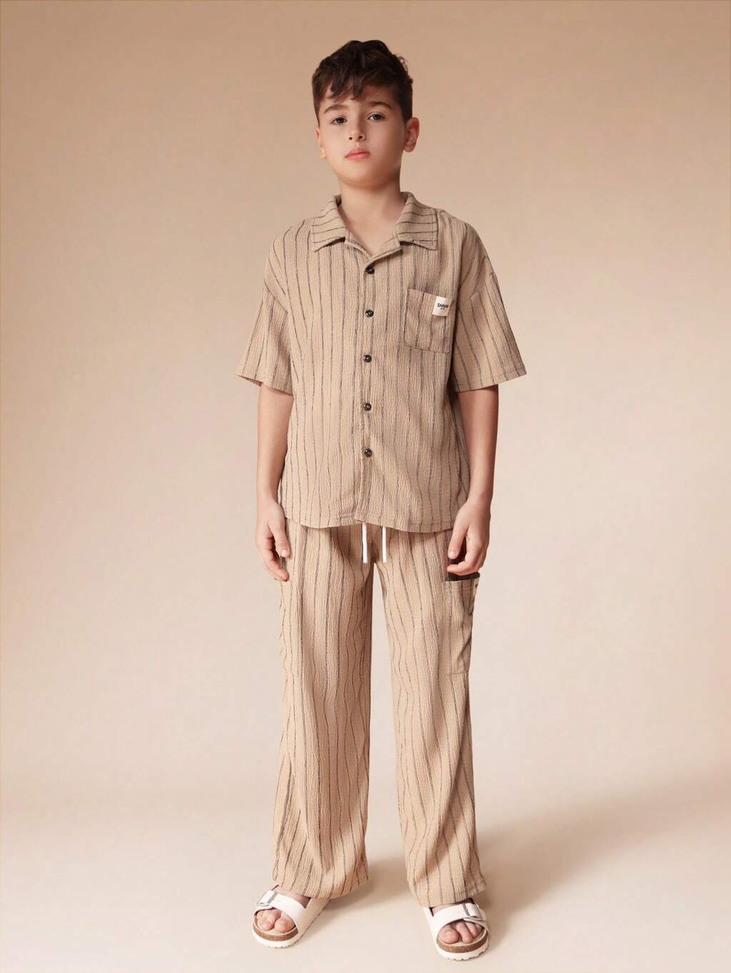 Dwuczęściowy komplet dla chłopców: koszula z krótkim rękawem w paski z lnianego materiału zapinana na guziki i spodenki chino, letni, swobodny, swobodny zestaw