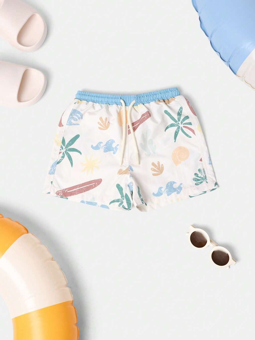 Regularne chłopięce letnie spodenki kąpielowe z nadrukiem pocztówki i ściągaczem w pasie na basen i wakacje