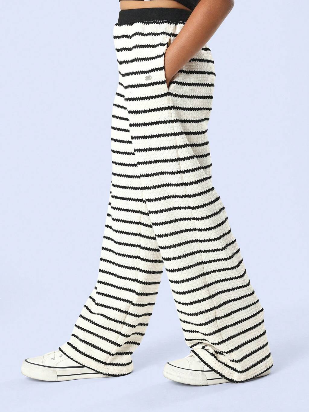 Kardigan z prążkowanej dzianiny zapinany na guziki i spodnie z szerokimi nogawkami